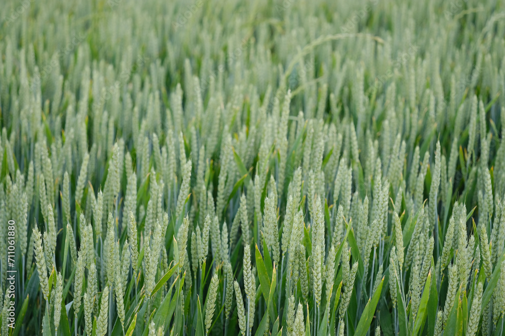 green ears of rye, wheat, barley sway in wind, beautiful summer landscape, concept of rich harvest of bread, food crisis, grain import, export abroad, growing crops