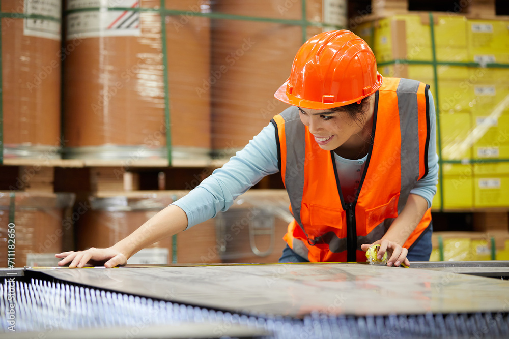 female factory worker using tape measure and measuring steel in the factory