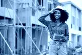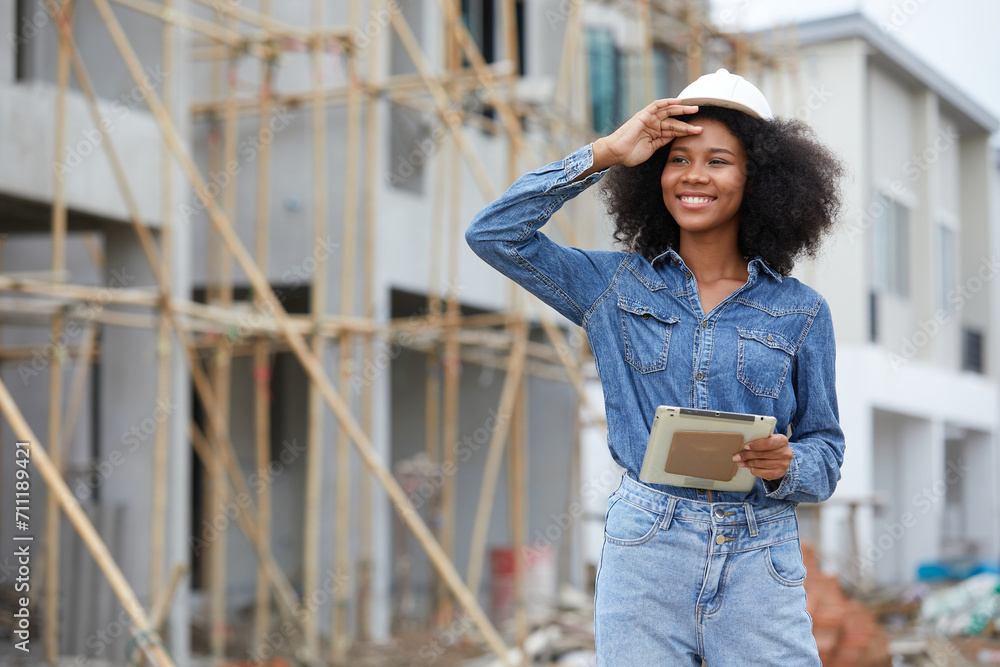 African worker or architect holding tablet and looking to something at construction site