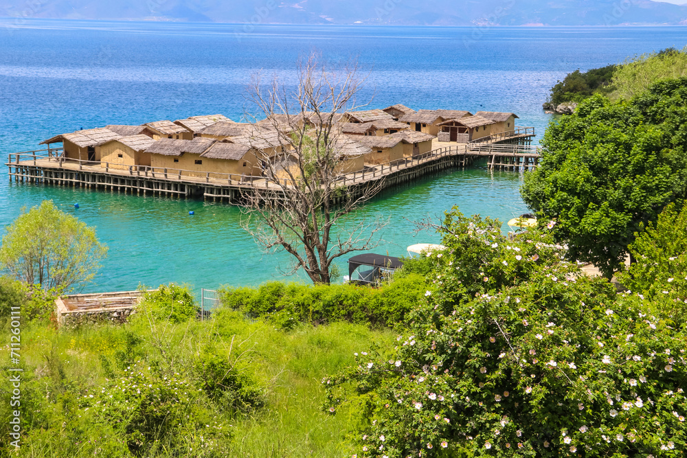 Museum on water, Bay of Bones, prehistoric pile-dwelling, recreation of a bronze age settlement on Lake Ohrid, North Macedonia