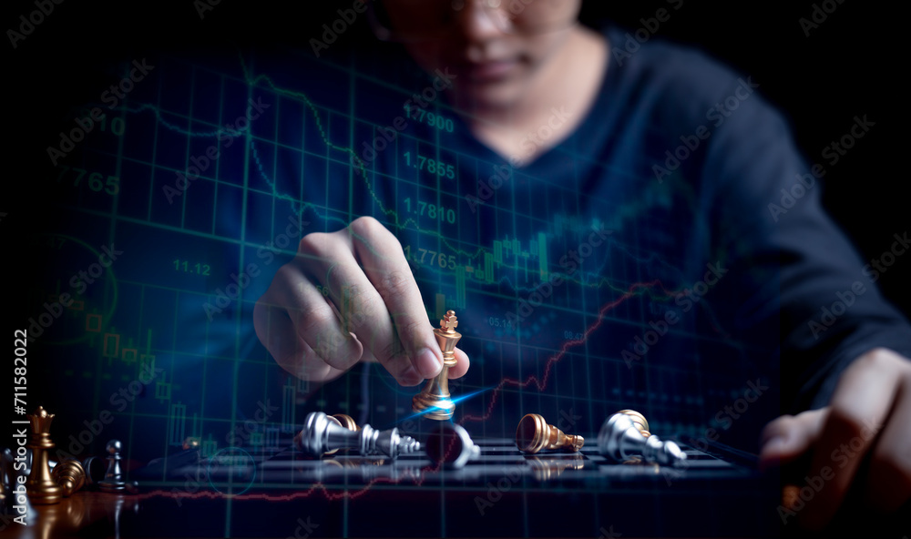 Double exposure chess game on strategy competitive market ,chess board behind business present financial investment and marketing strategy analysis is target in global economy concept.
