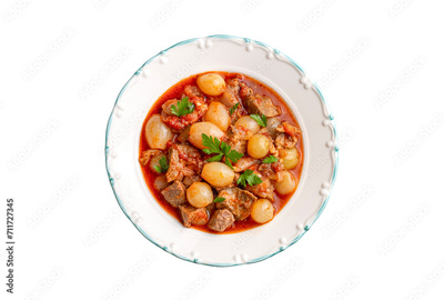 Traditional Greek dish of beef stifado in a sauce. Meat stew, onion stew. Turkish name; sogan yahni or et yahni