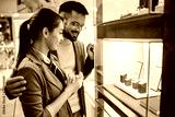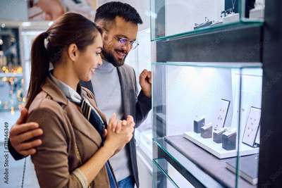 Young happy couple looking at jewelry in shop window.