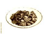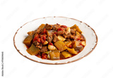 Top view of Turkish dish Guvech - baked meat with eggplant and traditionally served in earthenware pot (Turkish name; etli patlican guvec or patlican tava)