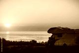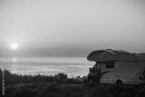 Caravan on sea at sunrise.