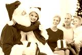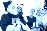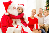 smiling family with santa claus and gifts at home
