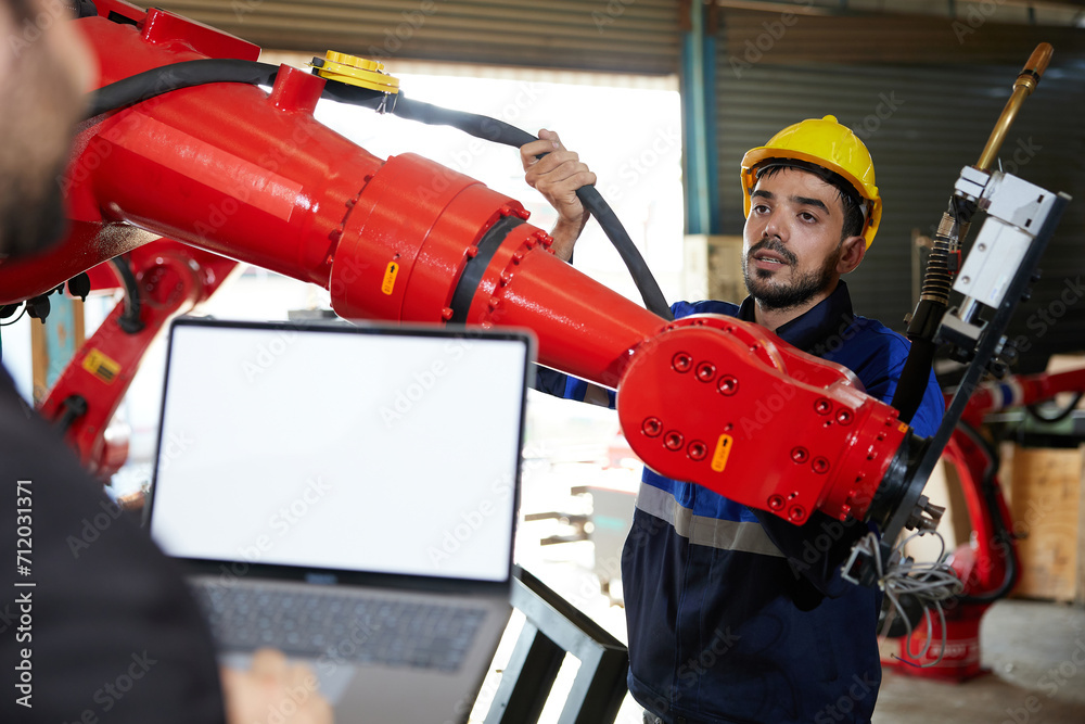 factory worker or engineer checking machine and boss using laptop computer for being observed in robot factory