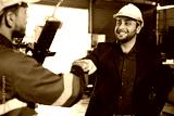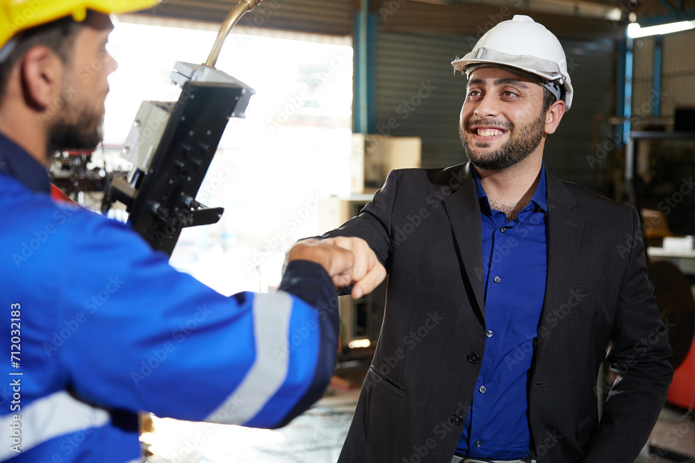 businessman fist bump with worker or engineer for agreement or success at works in the factory
