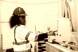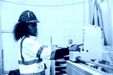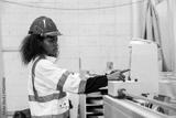 African black women worker work with wood cutter machine furniture factory industry with safety suit