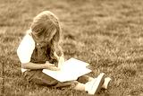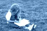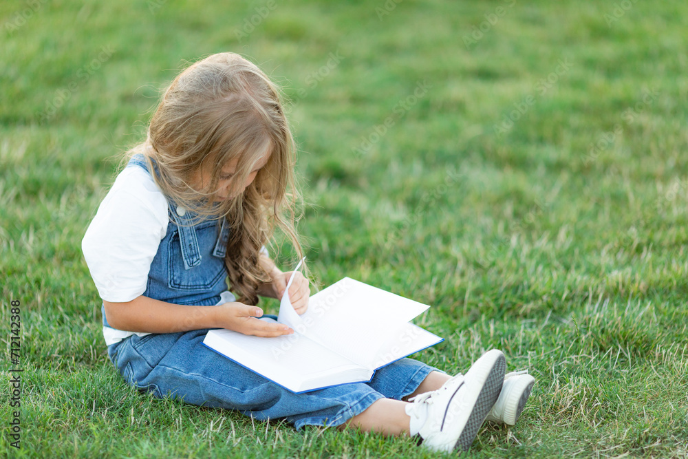 Cute little girl sitting on the grass and reading a book on summer day. Children education concept.