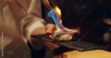 Hand, sushi and fire with chef in kitchen of restaurant for luxury or traditional cuisine closeup. Food, blow torch and cooking with person flame grilling fish or salmon for Japanese seafood meal