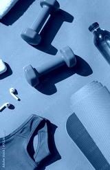 Sport or workout concept flat lay with blue dumbbells, sport wear, yoga mat and white wireless headphones on the grey background.