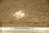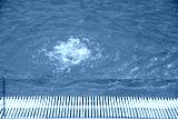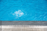 Splash water by filter pump at upscale swimming pool with linear drains, marble edge, clean water with ripples capillary waves, outdoor recreation