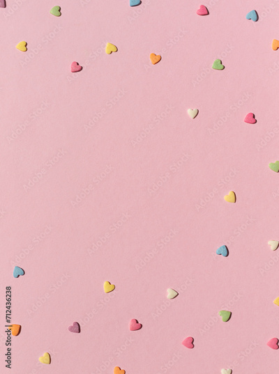 Valentine's day concept frame with colorful hearts on the pink background. Copy space