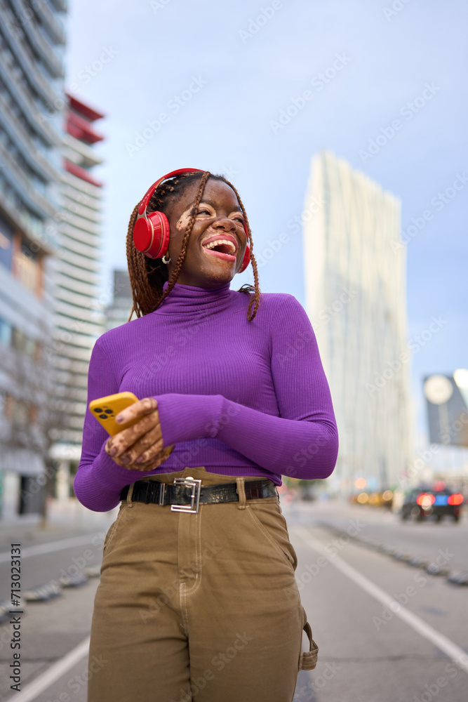 Joyful Woman Listening to Music in Urban Setting
