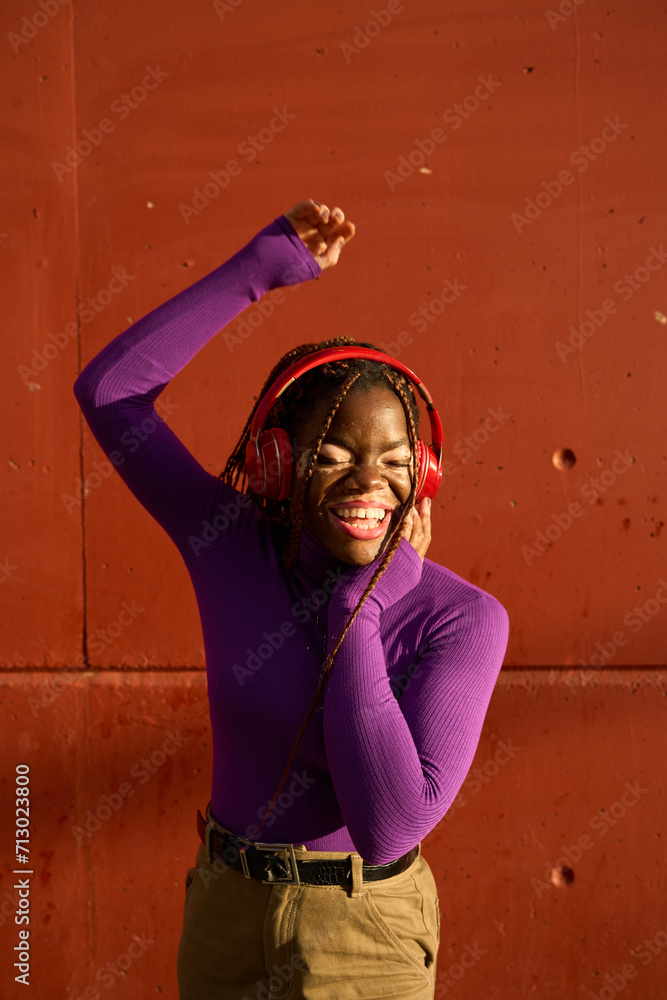 Radiant Young Woman Dancing with Red Headphones
