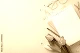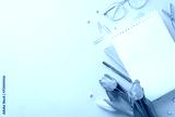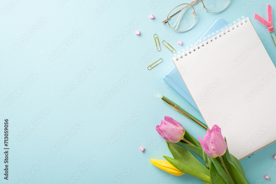 Professional Grace: Elevate Women's Day for the businesswoman. Top view of an office desk featuring classy glasses, notebooks, pen, clips, and tulips on a serene pastel blue surface