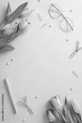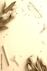 Corporate Charm: Celebrate Women's Day with a touch of sophistication. vertical top view of an office table setting with stylish glasses, stationery, and tulips against a serene pastel blue surface