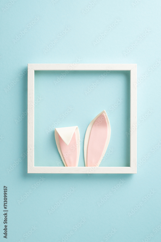Playful Easter happiness scene. Overhead vertical shot of an enchanting Easter bunny hiding in a photo frame, ears popping out joyfully on a soft blue background