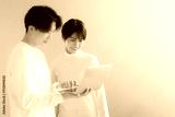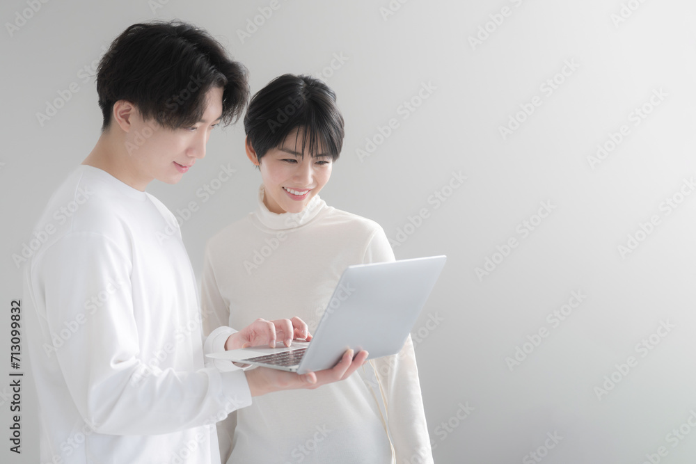 明るい白い部屋で一緒にパソコンを見る爽やかなアジア人(日本人)カップル