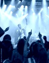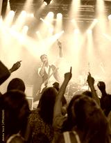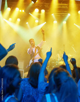 Man, singing and band or crowd at live concert performance for rock party, music festival or audience. Male people, instruments and hand up or entertainment artist show or listening, weekend or event