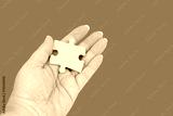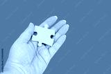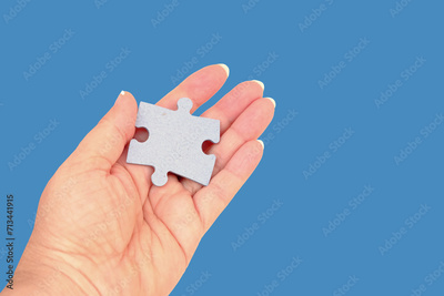 female hand holds cardboard puzzle piece, logical skills, puzzle solving and memory improvement, business concept for completing