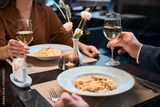 Cropped couple drinking wine from glasses and eating pasta in hotel restaurant