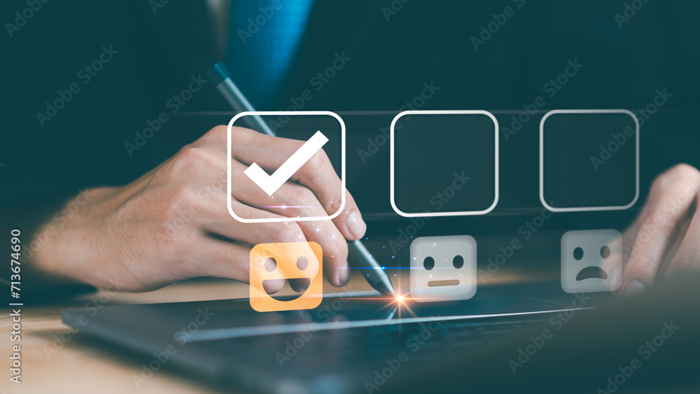 Male consumers rate their satisfaction and rate and review them online. Customer Experience Survey Concepts for Services and Products and Customer Engagement ,evaluation business success