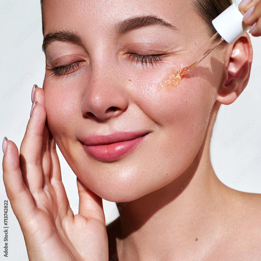 Moisturising and nourishing care serum. Close up beauty portrait of young woman with glowing skin is applying a vitamin c skincare product with a pipette dropper. Facial hydration cosmetics