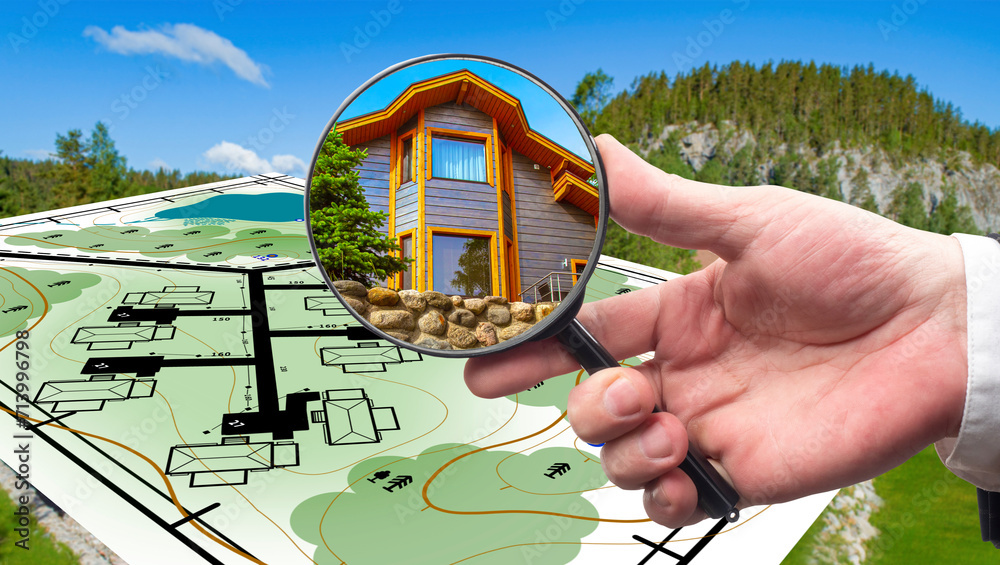 Country real estate. Village plan with villas. House under magnifying glass. Buying country house concept. Map of village in picturesque area. Buying and selling country house. Elite cottage
