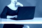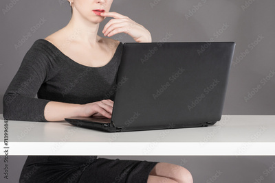 Businesswoman works with a computer. Concept - she is looking for something on Internet. Websites for women. Woman next to a laptop. Her face is not visible. Woman uses a laptop computer.