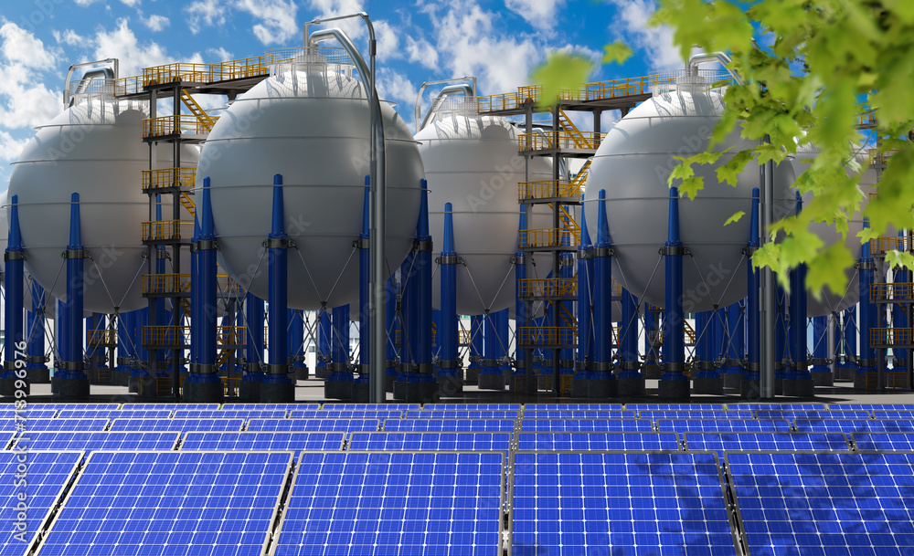 Energy enterprise. Solar panels. Tanks for liquefied gas innovative energy company. Plant for production of electricity. Getting electricity from sun. Sustainable energy. Solar generators. 3d image