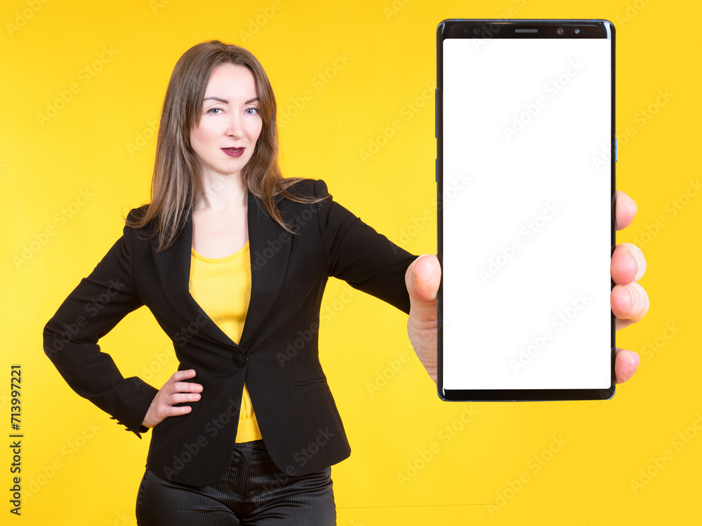 The girl demonstrates a smartphone with an empty screen. A place for text on the mobile phone screen. A slender brunette holds out her phone. A long-haired girl with a smartphone. Female with gadget