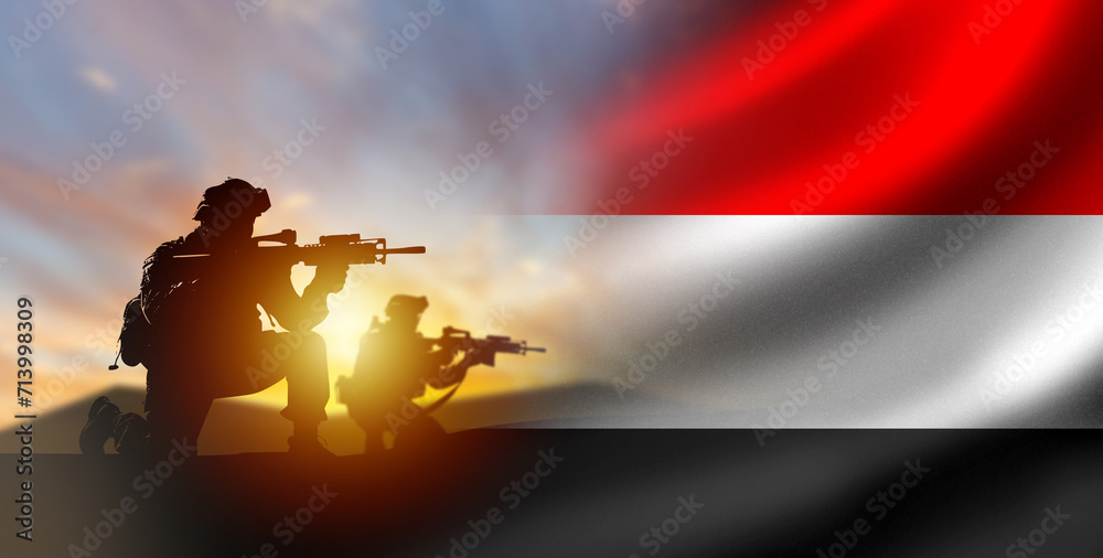 Soldiers with Yemen flag. Silhouettes of fighters at sunset. Yemen army. Military anti-terrorist operation concept. Soldiers state army. Yemen armed forces. Defense and anti-invasion forces. 3d image