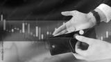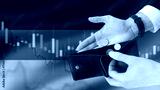 Crisis in Germany. Empty wallet in hands of unemployed man. Germany flag with crisis chart. Economic recession. Financial crisis. Man became bankrupt. Falling Germany income. Devaluation, inflation