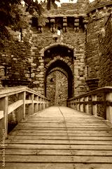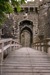 Bridge to the gatehouse and portcullis of an old stone medieval castle - Beaumaris Castle, Anglesey North Wales