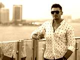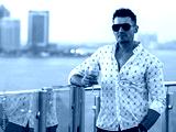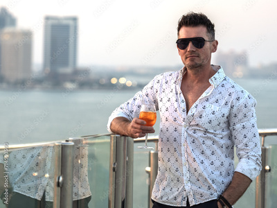 Stylish man with a glass of drink standing on the empty deck of a cruise liner against the backdrop of sea waves. Sunny, clear day. Close-up, outdoor. Vacation and travel concept
