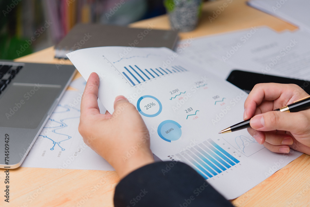 Close-up of a professional hand reviewing business document data performance analytics and printing statistical reports and planning marketing and financial strategy on a desk.