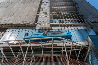 Construction blue concrete cradle on the lower floors of a skyscraper.