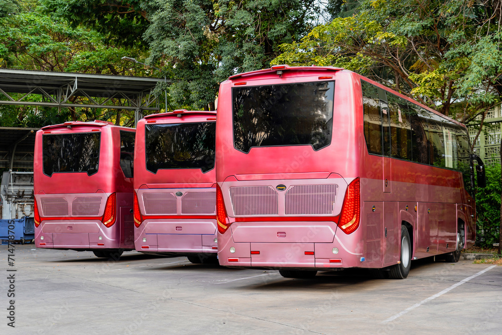 Red tourist buses in the parking lot, rear view against the backdrop of a city park on the final route destination