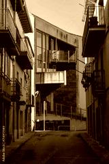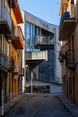 Narrow alley with a mix of old and modern buildings, featuring balconies and urban details