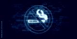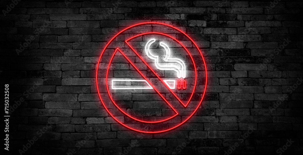 No smoking. Colorful neon sign with prohibition of smoking. Circle with fuming cigarette with smoke. Icon with nighttime neon illumination.