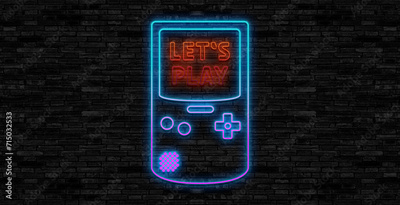 Let's Play neon sign, bright signboard, light banner. Game logo neon, emblem. Vector illustration.