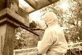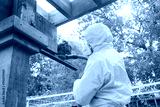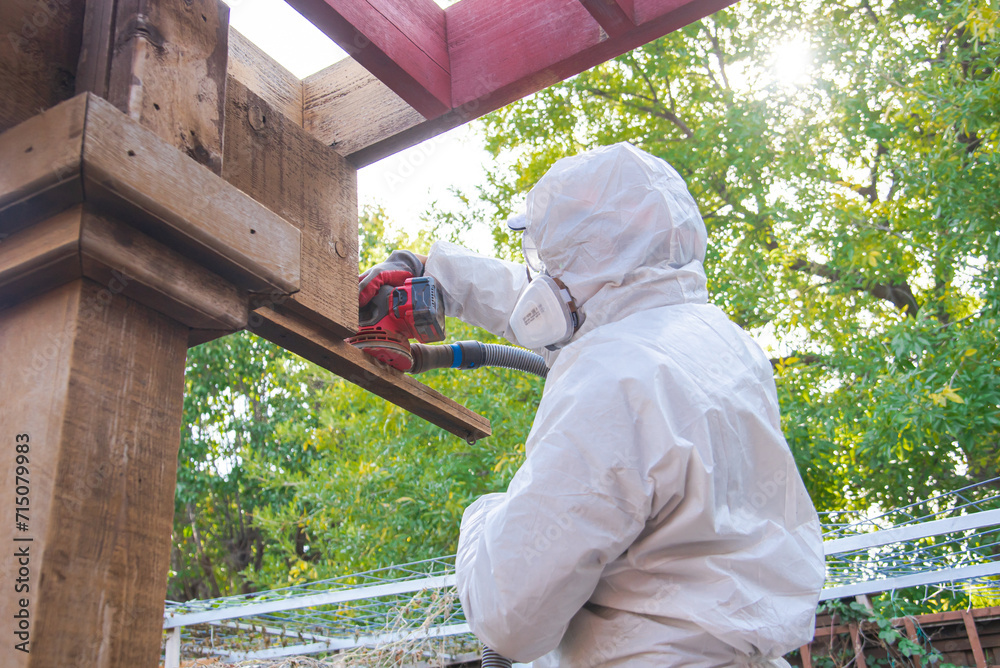 Close-up handyman in white hazmat suit full body protection, respirator mask, safety goggles, latex gloves using cordless orbit sander long vacuum attachment sanding pergola, backyard garden, US