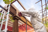 Upward view handyman white hazmat suit full body protection, respirator mask, safety goggles, latex gloves using cordless orbit sander long vacuum attachment sanding pergola, backyard garden, US