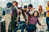 Diverse inclusive business people making a break while office chair racing