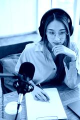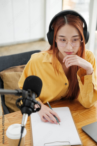 Female podcaster making audio podcast from her home studio