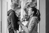 Happy mother getting her child son smiling getting dressed up putting sweater on. Good parenting childcare concept.