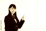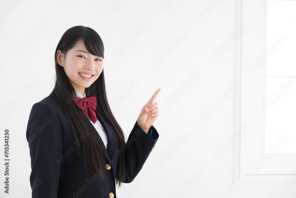 使いやすい白背景でカメラ目線正面で笑顔の女子高生 指さしでオススメポーズ 右にコピースペースあり