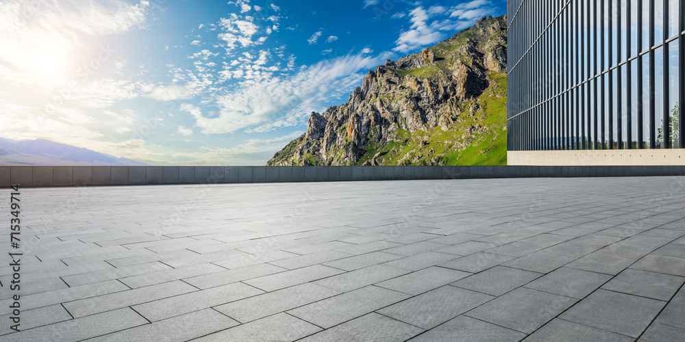 Empty square floor and glass wall with mountain nature landscape at sunset